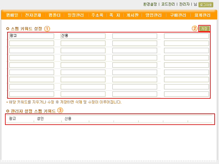 ½ºÆÔ ¸ÞÀÏ Â÷´ÜÀ» À§ÇÑ ½ºÆÔ Ű¿öµå¸¦ »ç¿ëÀÚ°¡ µî·ÏÇϴ ȸéÀÌ Ãâ·ÂµË´Ï´Ù. ÇØ´ç Ä¿¡ ½ºÆÔŰ¿öµå¸¦ µî·ÏÇϽðí ÀúÀåÀ» ÇÏ½Ã¸é µî·ÏµÈ ½ºÆÔ´Ü¾î°¡ Æ÷ÇÔµÈ ¸ÞÀÏÀº ½ºÆÔ󸮰¡ µË´Ï´Ù. ÇÏ´Ü¿¡ °ü¸®ÀÚ ¼³Á¤ ½ºÆÔ Ű¿öµå´Â °ü¸®ÀÚ°¡ ÀϰýÀûÀ¸·Î µî·ÏµÈ ½ºÆÔ Ű¿öµå¸¦ ³ªÅ¸³À´Ï´Ù. |