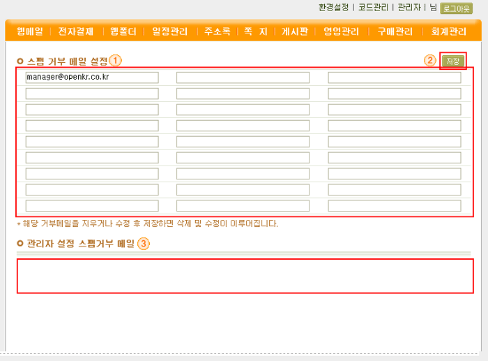 ½ºÆÔ ¸ÞÀÏ Â÷´ÜÀ» À§ÇÑ ½ºÆÔ ¸ÞÀÏÁÖ¼Ò¸¦ »ç¿ëÀÚ°¡ µî·ÏÇϴ ȸéÀÌ Ãâ·ÂµË´Ï´Ù. ÇØ´ç Ä¿¡ ½ºÆÔÀ¸·Î ó¸®ÇÒ ¸ÞÀÏÁÖ¼Ò¸¦ µî·ÏÇϽðí ÀúÀåÀ» ÇÏ½Ã¸é µî·ÏµÈ ½ºÆÔ ¸ÞÀÏÁÖ¼Ò°¡ Æ÷ÇÔµÈ ¸ÞÀÏÀº ½ºÆÔ󸮰¡ µË´Ï´Ù. ÇÏ´Ü¿¡ °ü¸®ÀÚ ¼³Á¤ ½ºÆÔ ¸ÞÀÏÀº °ü¸®ÀÚ°¡ ÀϰýÀûÀ¸·Î µî·ÏµÈ ½ºÆÔ ¸ÞÀÏÁÖ¼Ò¸¦ ³ªÅ¸³À´Ï´Ù. |