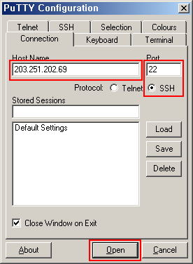 putty ÇÁ·Î±×·¥ÀÌ ½ÇÇàµÇ¸é HostName ¿¡ ºÎ¿© ¹ÞÀº ¼¹ö Á¢¼Ó ¾ÆÀÌÇǸ¦ ÀÔ·ÂÇÕ´Ï´Ù. Port´Â 22·Î ¸ÂÃ߽ðí Protocot´Â SSH¸¦ ¼±ÅÃÇÕ´Ï´Ù. |