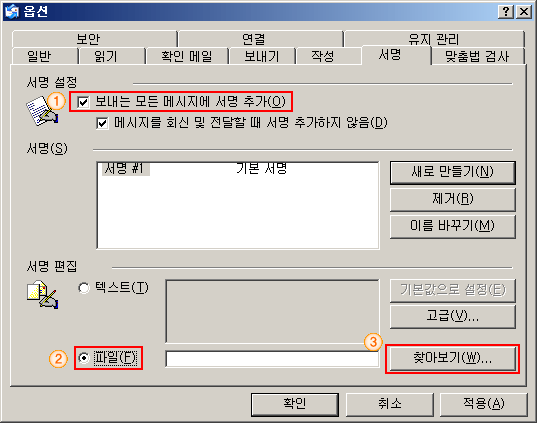 [º¸³»´Â ¸ðµç ¸Þ½ÃÁö¿¡ ¼­¸í Ãß°¡] Ç׸ñÀ» ¼±ÅÃÇϰí, ¼­¸í ÆíÁý ¸Þ´º¿¡¼­ ÆÄÀÏÀ» üũ ÈÄ [ã¾Æº¸±â] ¹öưÀ» Ŭ¸¯ÇÕ´Ï´Ù.