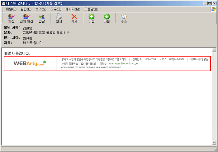 ¾Æ·¡ È­¸éÀº ¼­¸í ¸Þ´º¸¦ Àû¿ëÇØ¼­ ¸ÞÀÏÀ» ¹ß¼Û ÈÄ ¹ß¼ÛµÈ ¸ÞÀÏÀÇ ³»¿ëÀÔ´Ï´Ù.